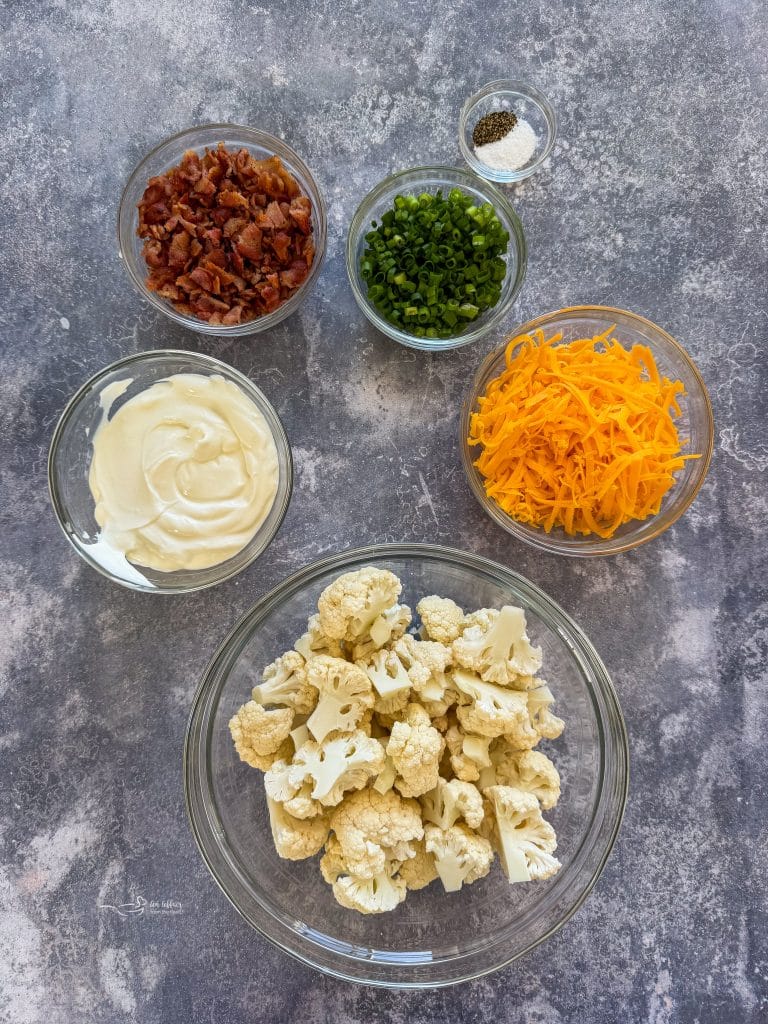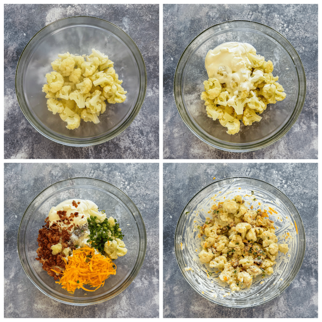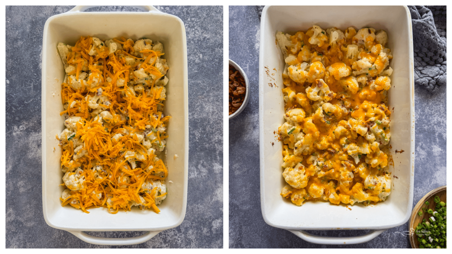 - Place cauliflower, sour cream, half of bacon, half of scallions, half of cheese in a bowl and salt and pepper. Stir to combine. Transfer to casserole dish, sprinkle with other half of cheese.