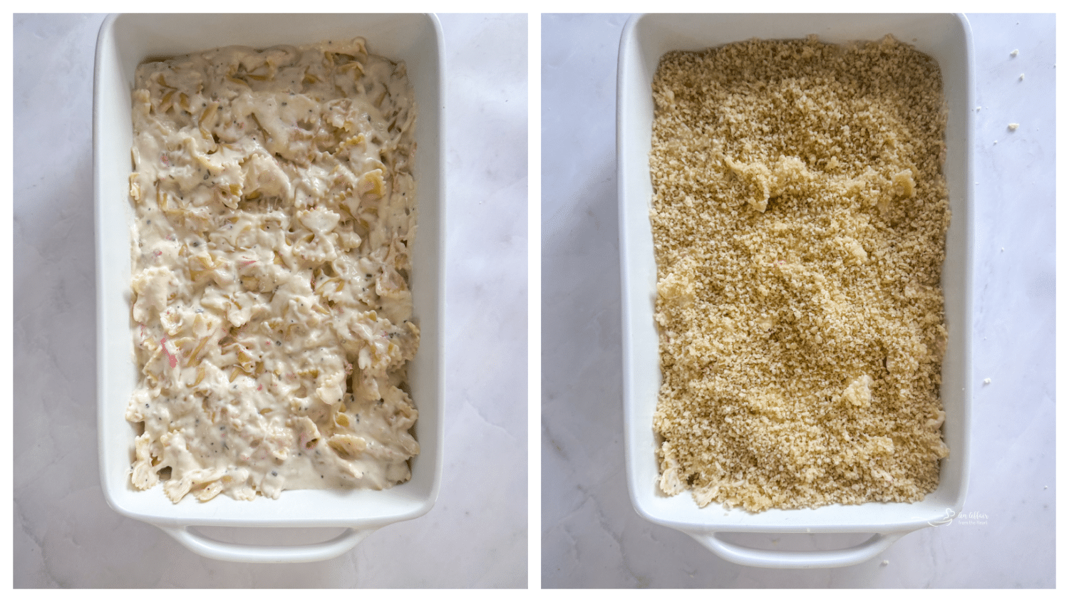 Pour the pasta into the prepared baking dish and top with the panko bread crumbs.