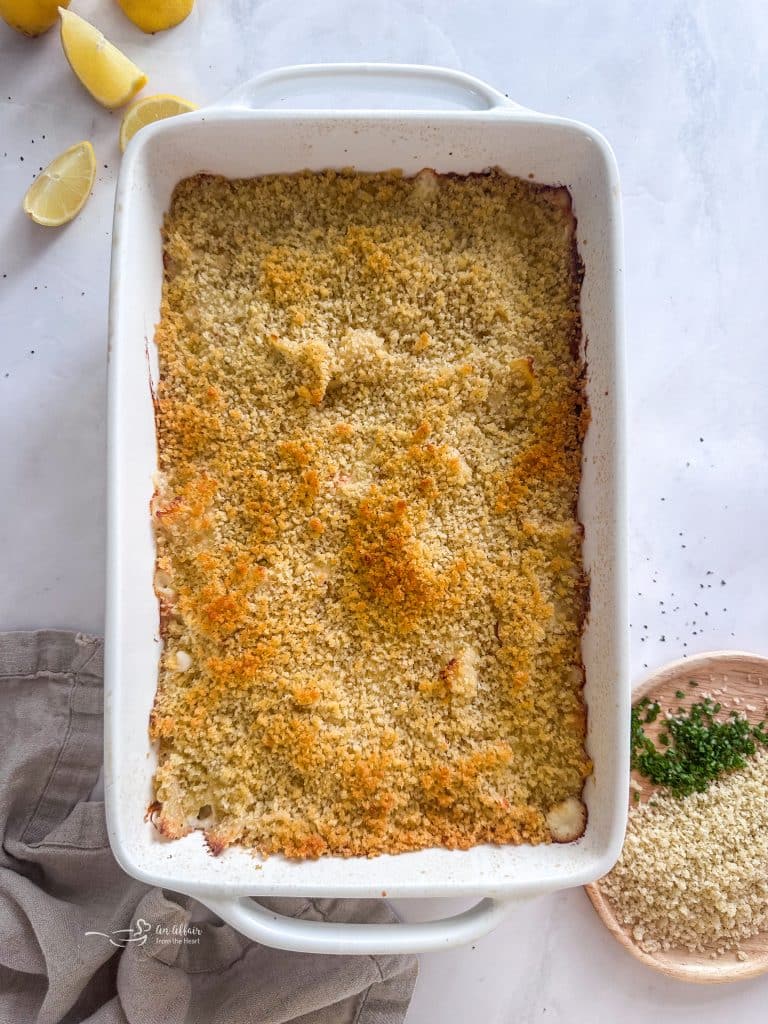 • Panko bread crumbs create that irresistible buttery crunch on top. They stay crisp and golden in the oven.