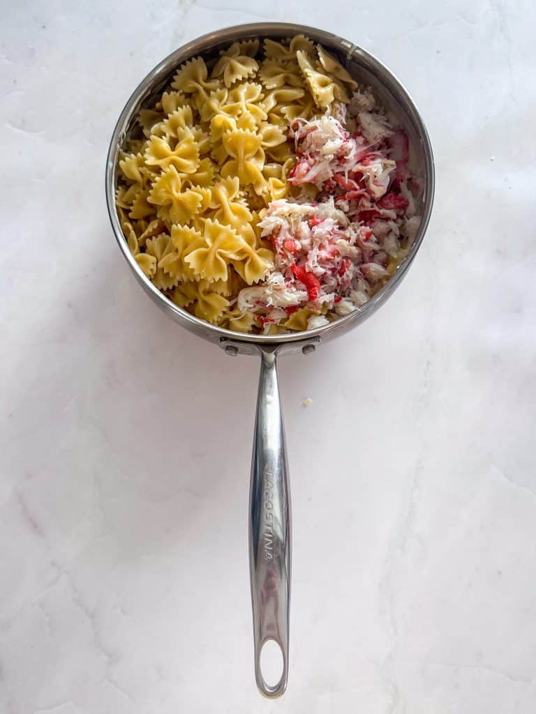 Gently fold in the crab meat and cooked pasta, being careful not to break up the crab too much.