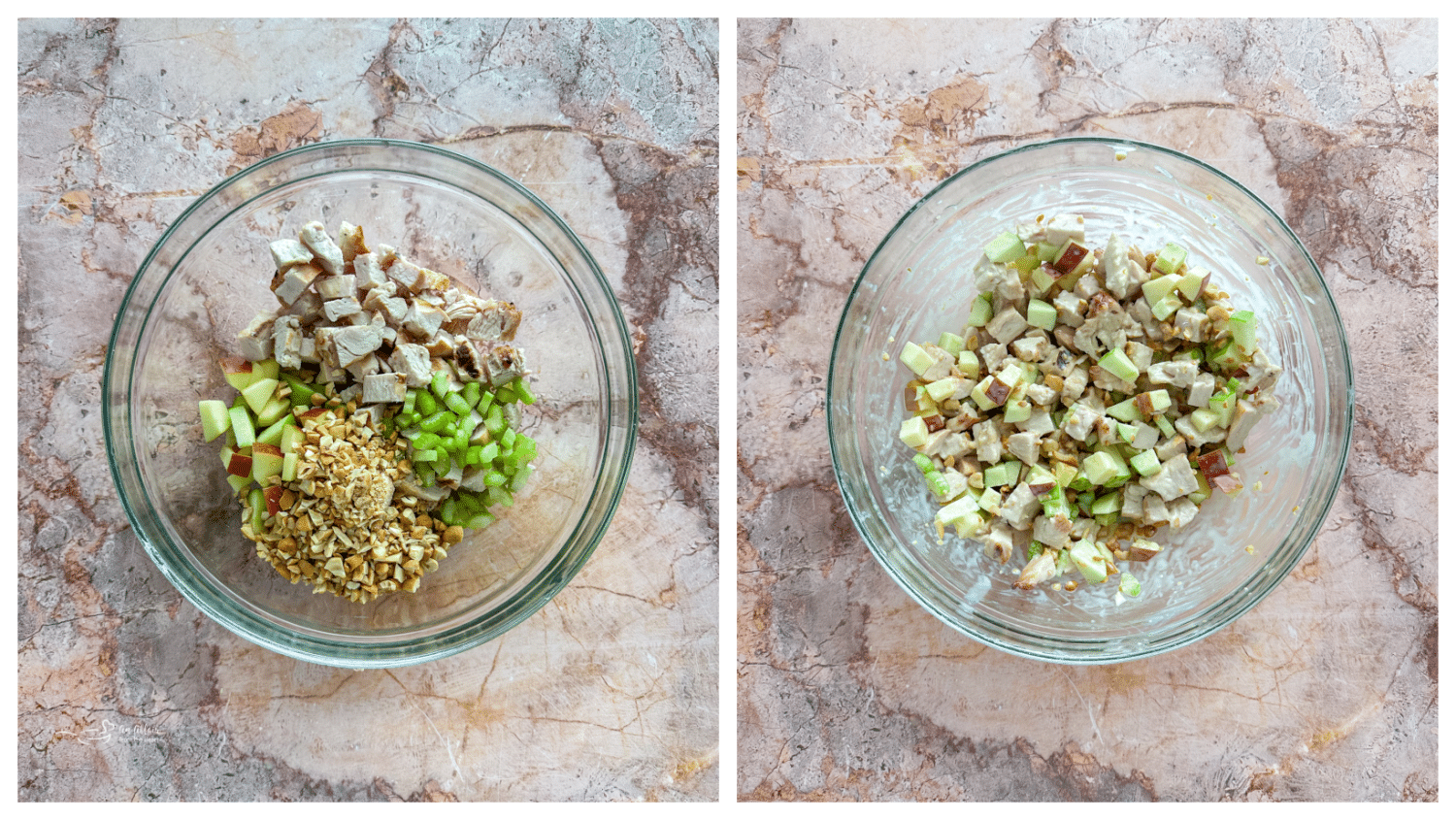 - Add the chicken, celery, apples and cashews to a bowl. Pour dressing over, and stir to combine.