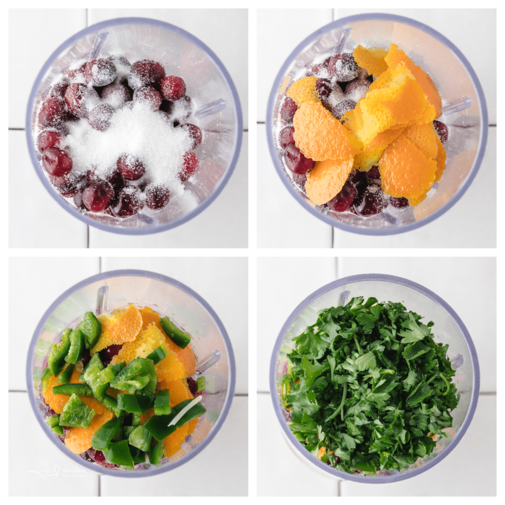 - In a blender or food processor, add the cranberries, sugar, orange zest, orange juice, jalapenos,and cilantro and pulse until finely chopped.