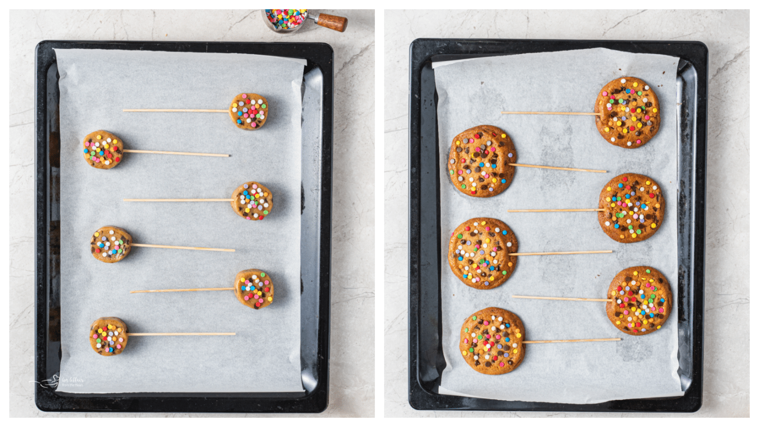 - Use your favorite homemade cookie recipe. – If you prefer baking from scratch, your favorite homemade chocolate chip cookie dough works beautifully for this project. Just make sure the cookies are slightly larger and sturdy enough to hold a lollipop stick.