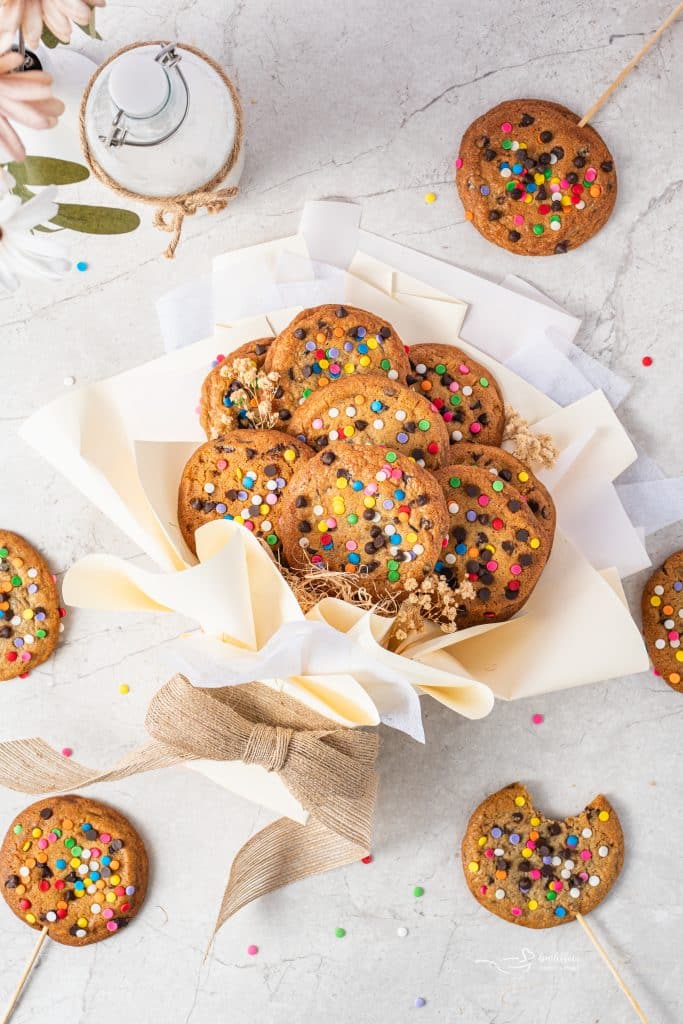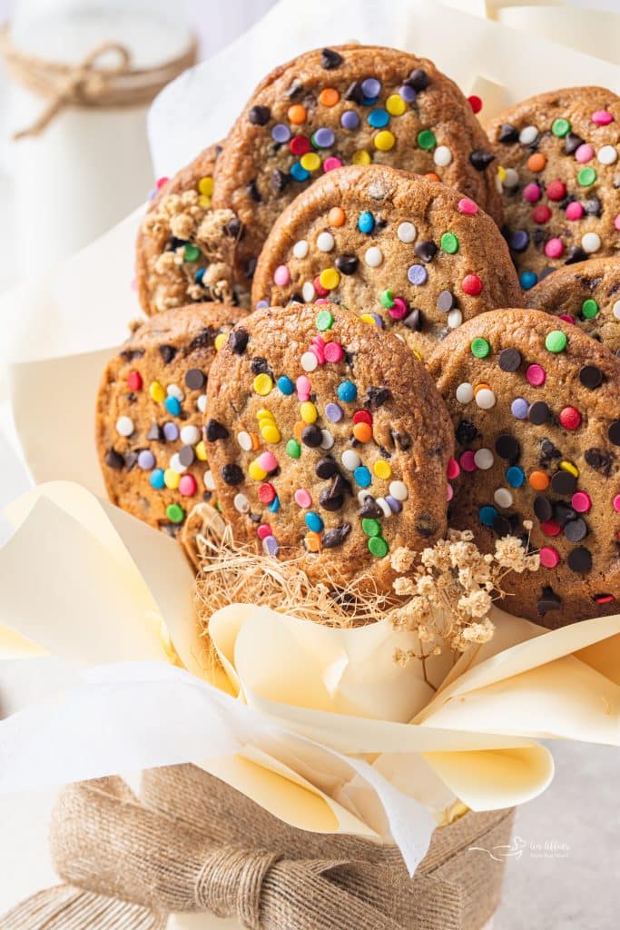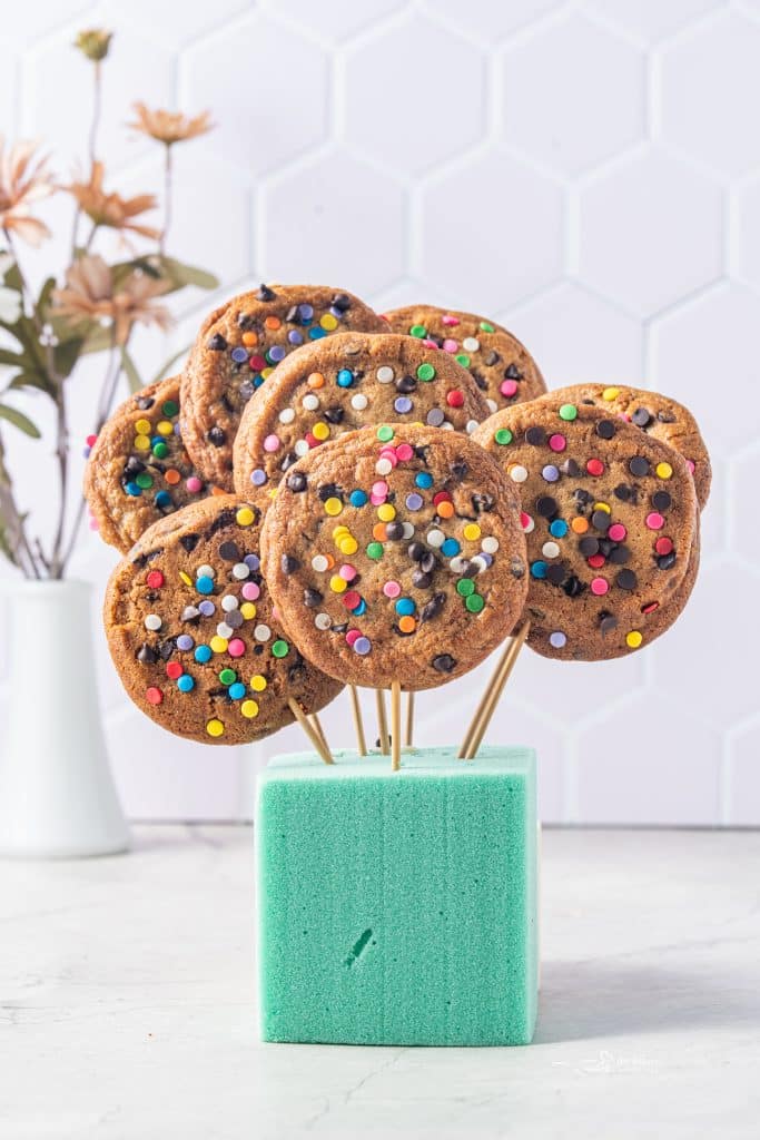 One of the best things about a cookie bouquet is how easy it is to customize. While giant chocolate chip cookies are a classic choice, you can easily switch things up depending on what you have on hand or the occasion you’re making them for.
