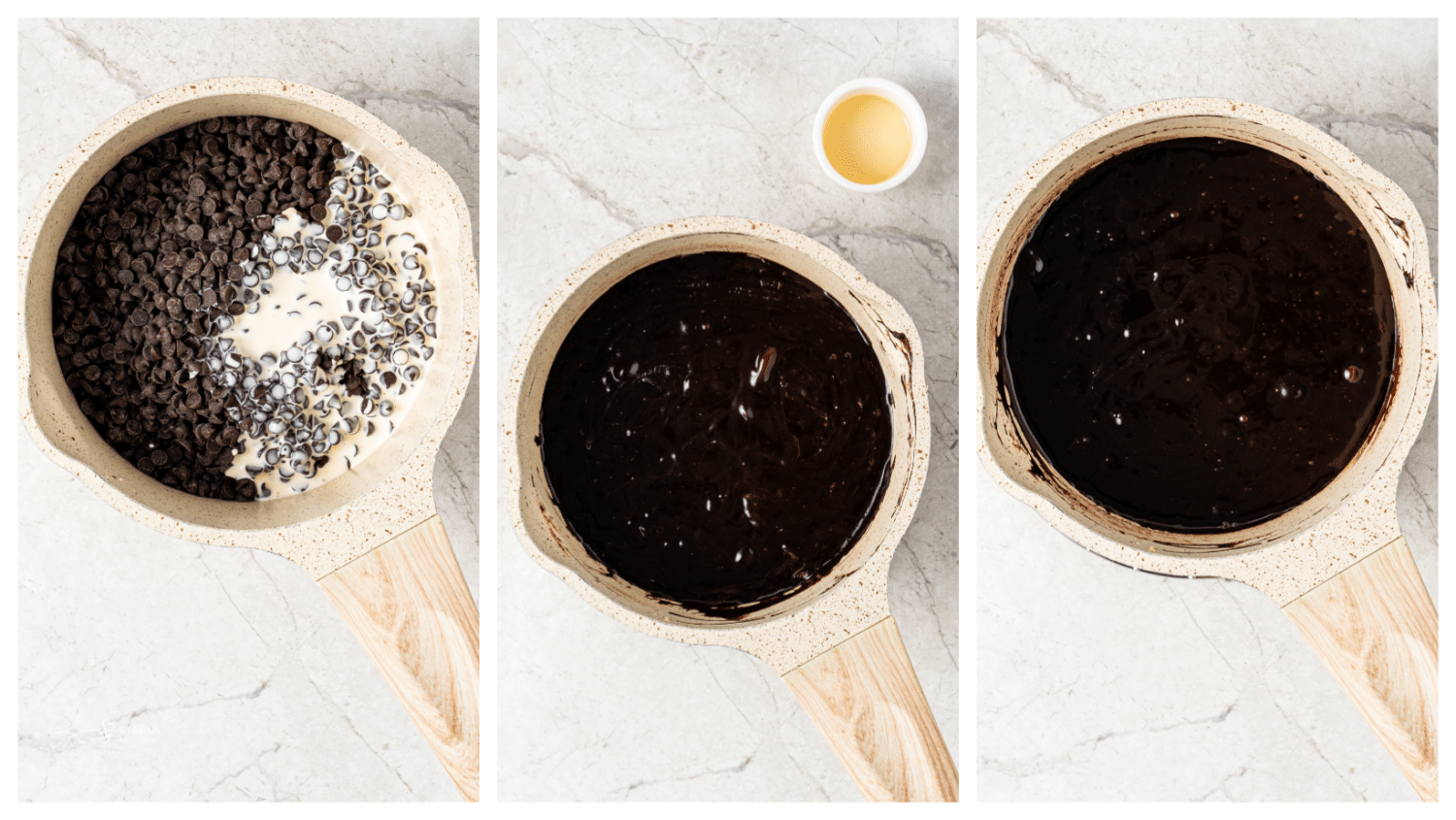- Melt chocolate and cream in a pan over low heat, stirring constantly.