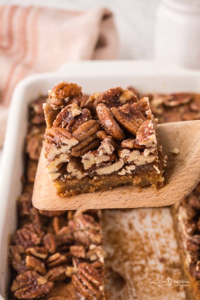 - Candied crunch: Coating the pecans in corn syrup helps create that shiny, crunchy “candied pecan” topping that makes these bars irresistible.