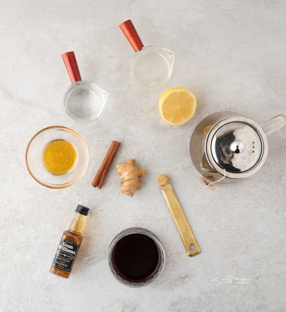 • 1 ½ ounce whiskey or bourbon or 2 oz hot chamomile tea for alcohol free version