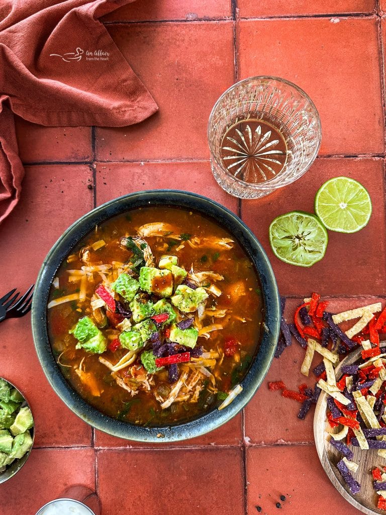 Close up of slow cooker Enchilada soup topped with avocado and tortilla strips.